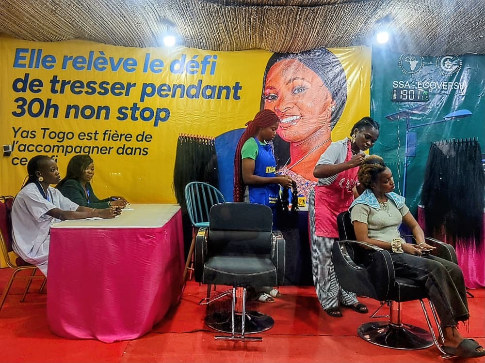 L’événement, soutenu par Yas Togo, sponsor officiel, s’est ouvert dans une ambiance festive sur le terrain du Lycée Agoè-nyivé, à Lomé. Eunice Etou, patronne tresseuse et figure montante de l’artisanat local, s’est engagée à tresser au moins 30 têtes, à raison d’une par heure, jusqu’à l’aube du dimanche 4 janvier 2026. Le chrono a été déclenché vers 19 heures.